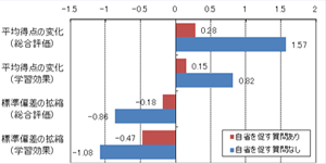 また、 “自らの取り組みが十分であったか”を生徒・学生に自省させる質問を加えると、授業改善が遅れて講座間での格差も縮小しない(上図参照)ことが分かっています。評価者側では、自省を促されることで断定的な評価が下せない(=中央化傾向が強まる)ようになることに加え、被評価者側では、授業が抱える問題を学生の怠慢に起因するものと混同することが、その原因と考えられます。